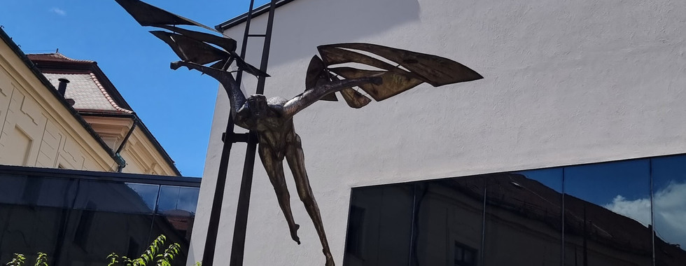כיכר מלבנית בקצה עומד פסלו של אישטוואן מניף את חרבו מעלה כמנצח.